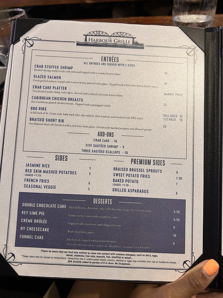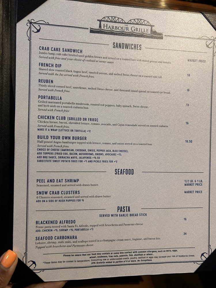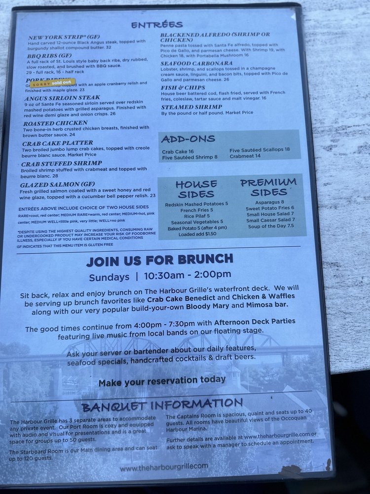Introducing The Harbour Grille, a New American restaurant located at 13188 Marina Way Woodbridge, VA. This veteran-owned establishment offers a wide range of dishes, from Braised Short Rib Hand-Carved Steak to BBQ Ribs and Seafood Carbonara. The menu also includes various salads, sandwiches like the Crabcake Sandwich and Rueben, and burgers like the B.Y.O. Burger. A standout dish is the Shrimp and Grits, praised for its perfect balance of texture and flavors. The ambiance is praised by customers, with indoor and outdoor seating offering gorgeous waterfront views. The service is top-notch, with attentive staff like Siera providing a memorable dining experience. Don't miss out on their Happy Hour specials, full bar, and the option to bring your dog along. Experience delicious food, great service, and beautiful views at The Harbour Grille today!